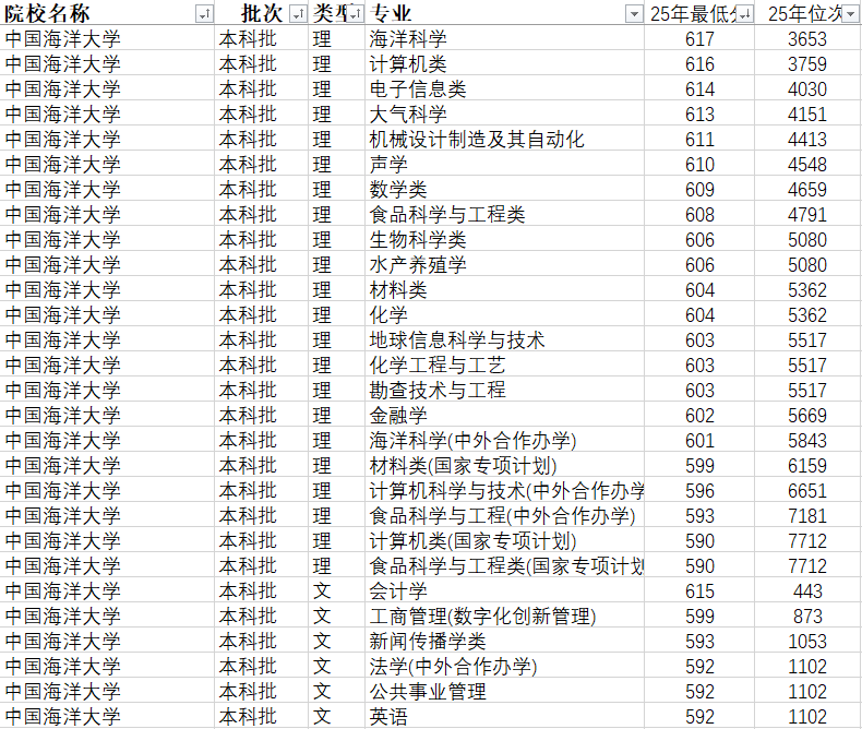 :物理类的海洋科学、水产养殖学、食品科学与工程、计算机科学与技术,历史类的法学(海洋环境法方向)、会计学、金融学,2025年物理类国家专项计划最低590分、普通类最低602分,历史类普通类最低592分即可报考,适配高分段考生。